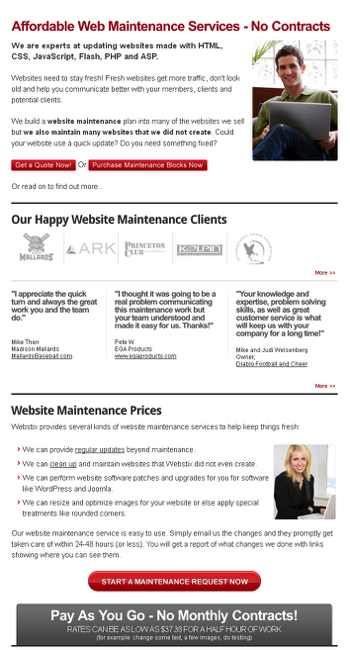 This type of landing page is like the first kind except the normal site template is used - typically the inside page design. The header, footer and navigation might remain but the sidebar might be removed. When you use this type of landing page, you're still giving people the option to get to other pages of your website but you're emphasizing certain content. This type of page is in between a regular inside page and a landing page so that you get another option - sort of the best of both worlds.