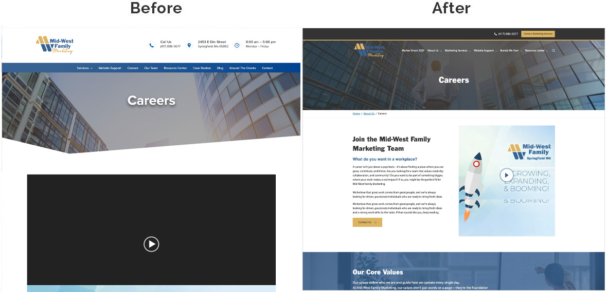 The redesigned website delivers a polished, conversion-driven experience that showcases Mid-West Family Springfield’s marketing expertise, highlights their strong local roots, and reinforces their mission of connecting businesses with communities. Visitors can easily explore services, read success stories, and request consultations, resulting in increased engagement and lead generation.